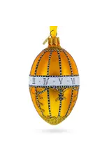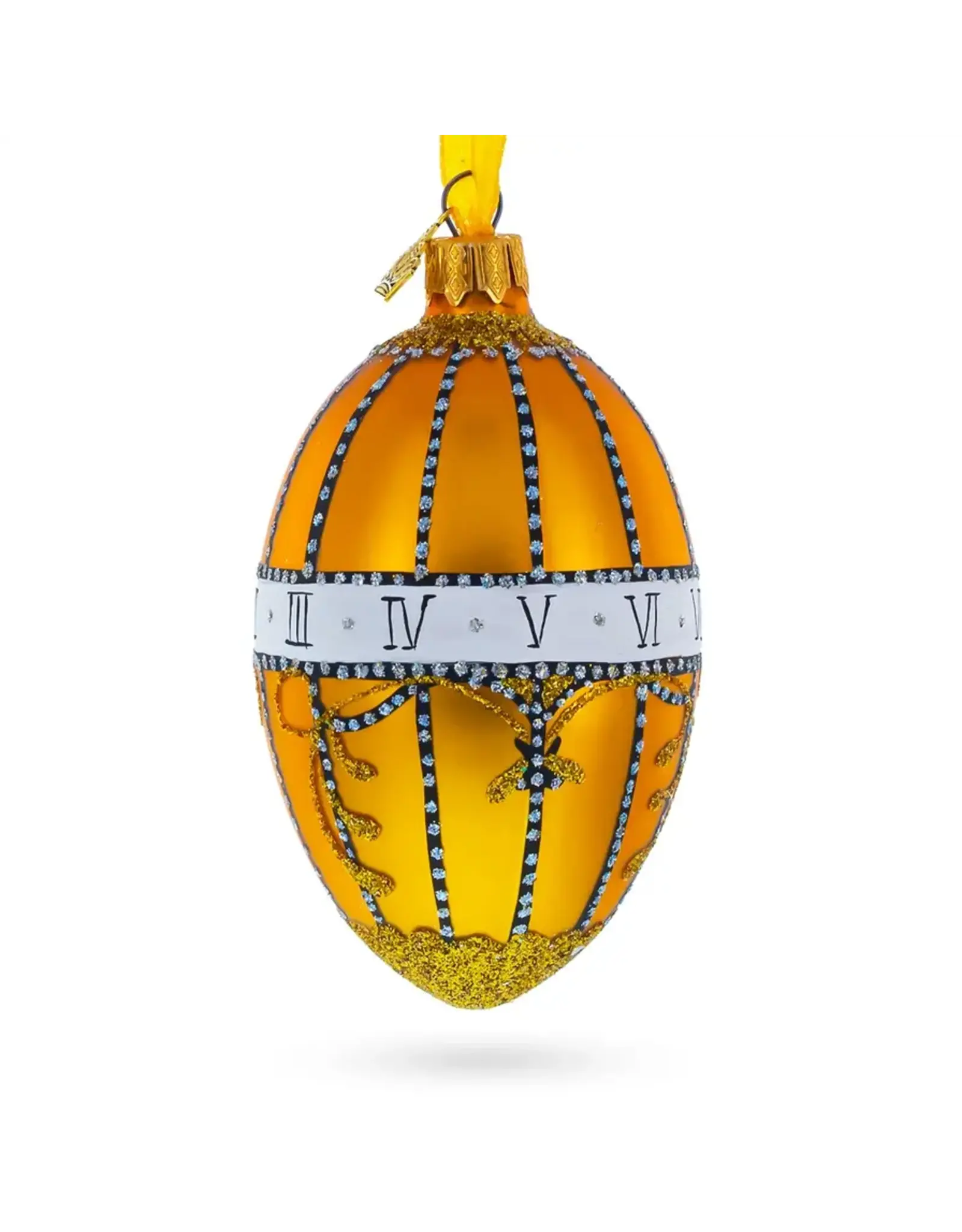 A beautiful glass egg ornament with beading and a white band with Roman numerals on a gold background. Based on the 1899 Romanov Fabergé egg. Handmade in Ukraine. Measures 4" 2.4".